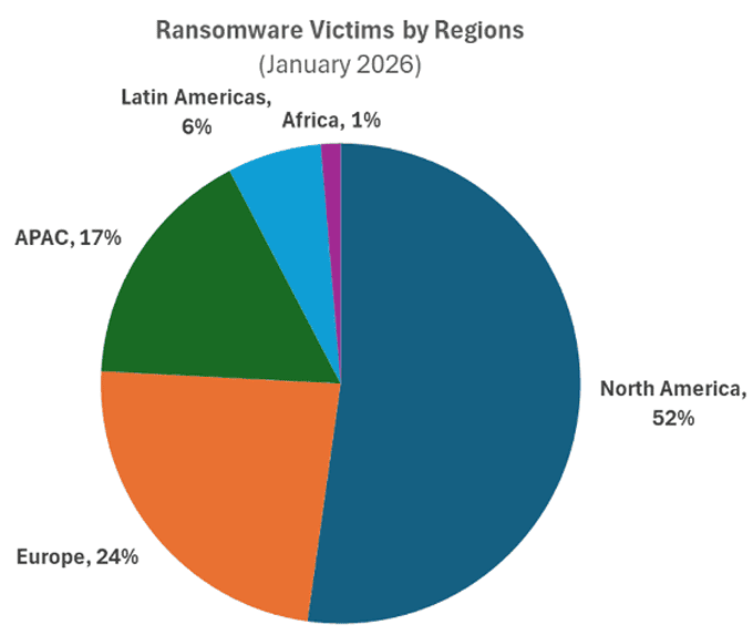 Ransomware-Aktivitäten nahmen im Januar 2026 mit 678 öffentlich gemeldeten Angriffen um zehn Prozent weiter zu. Auf Nordamerika entfielen 52 Prozent der Ransomware-Opfer, gefolgt von Europa mit 24 Prozent. Die USA blieben mit 48 Prozent das am stärksten betroffene Land, gefolgt von Grossbritannien (fünf Prozent), Kanada (vier Prozent), Deutschland (vier Prozent) und Italien (drei Prozent).