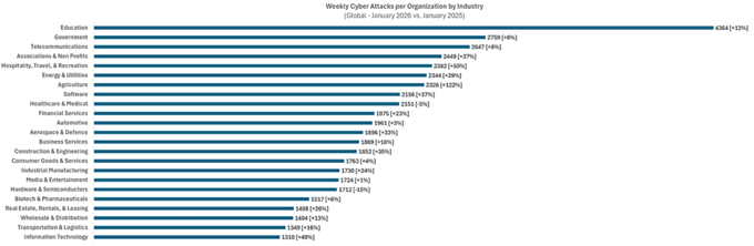 Der Bildungssektor bleibt global mit durchschnittlich 4364 Angriffen pro Organisation und Woche die am stärksten betroffene Branche – ein Anstieg von zwölf Prozent im Vergleich zum Vorjahr. Die grosse Angriffsfläche, hohe Nutzerzahlen und oftmals veraltete Infrastrukturen machen diesen Sektor besonders anfällig. Der Regierungssektor folgt mit 2759 wöchentlichen Angriffen (plus acht Prozent), während Telekommunikations-Unternehmen mit 2647 Attacken auf den dritten Platz vorrückten.