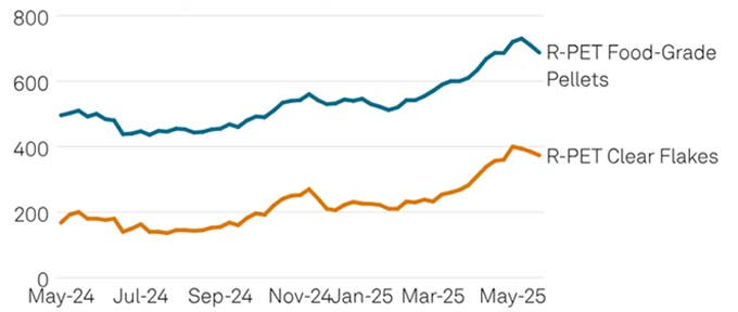 The chart shows the price differences between two types of recycled PET plastic (food-grade regranulate and transparent flakes) and new PET plastic in Europe. Recycled plastics are considerably more expensive. In May, the price for food-grade regranulate was EUR 700/tonne, EUR 400 higher than for virgin PET regranulate. Food-grade regranulate is processed according to stricter quality standards and can be used for food or medicine packaging, for example. Transparent flakes are used as a base material for industrial applications with less stringent quality criteria.